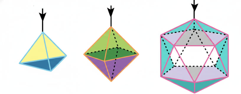 Polyhedrons (or polyhedra) are 3D solid shapes made only of flat polygon faces. They have straight edges and corner points called vertices. A cube has six square faces, a dodecahedron has 12 pentagonal faces, and an icosahedron has 20 triangular faces.